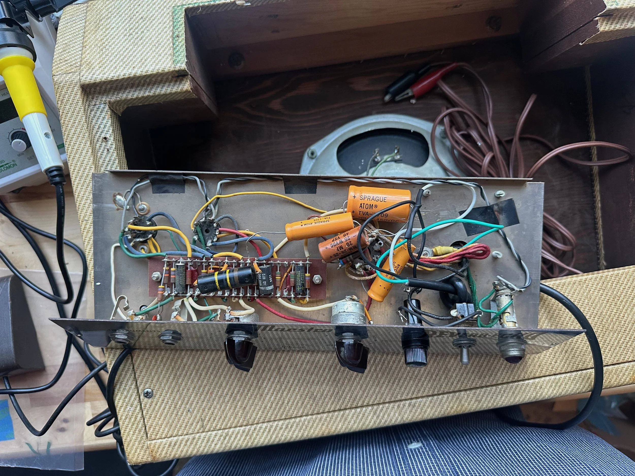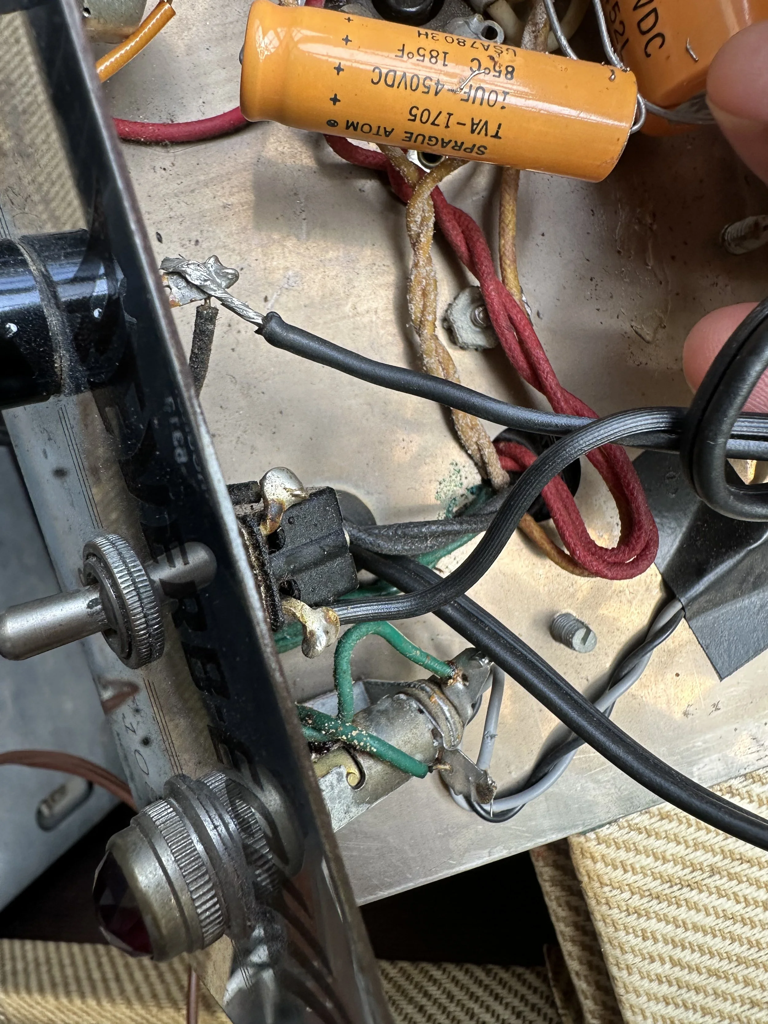 The amplifier was shorted where the fuse once was so there was zero current protection. This is dangerous. The amplifier also had the original two prong plug and “death cap.”